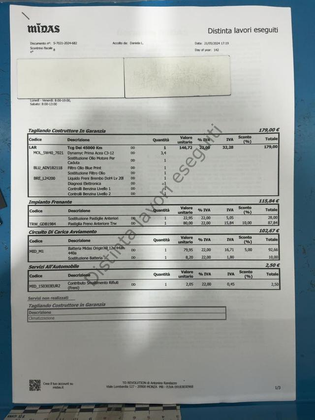 Manutenzione effettuata regolarmente con ultimo tagliando eseguito a maggio 2024 a 40.000Km con sostituzione pastiglie anteriori, cambio olio e filtri. Revisione ministeriale da eseguire prima della consegna a carico del cliente.